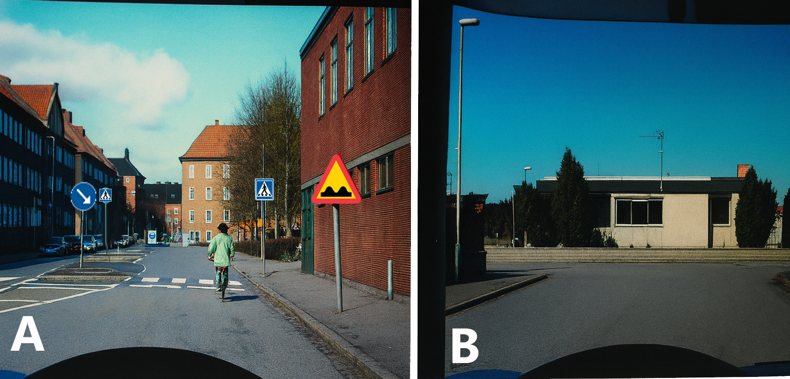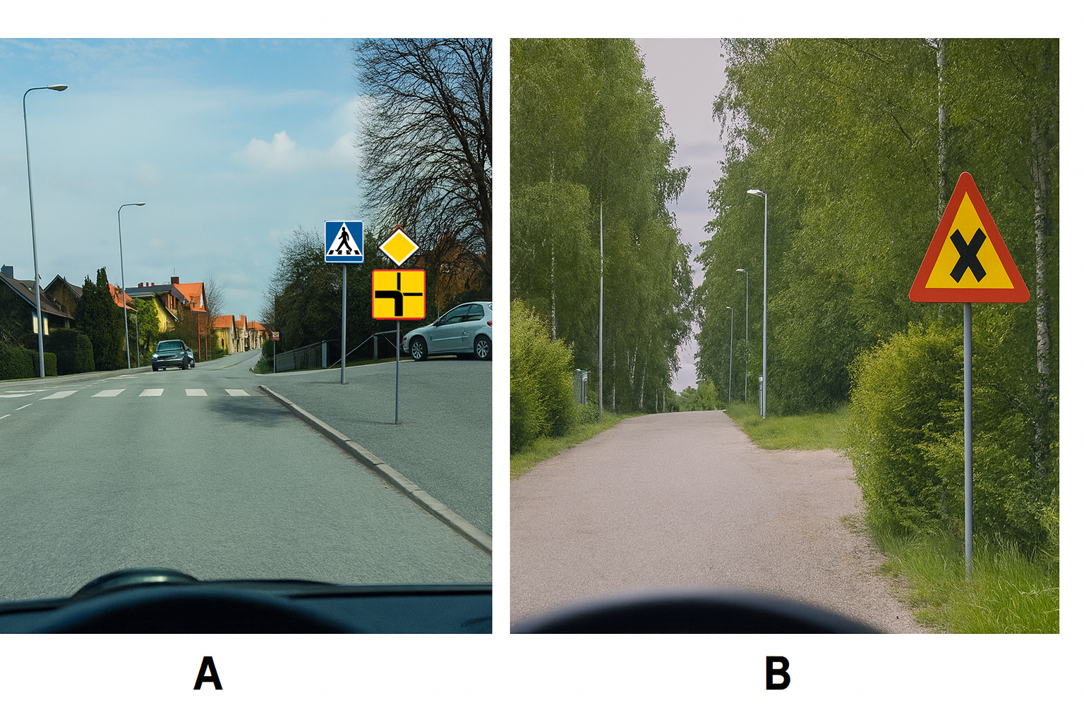 Du ska köra rakt fram. Gäller högerregeln i någon av situationerna?