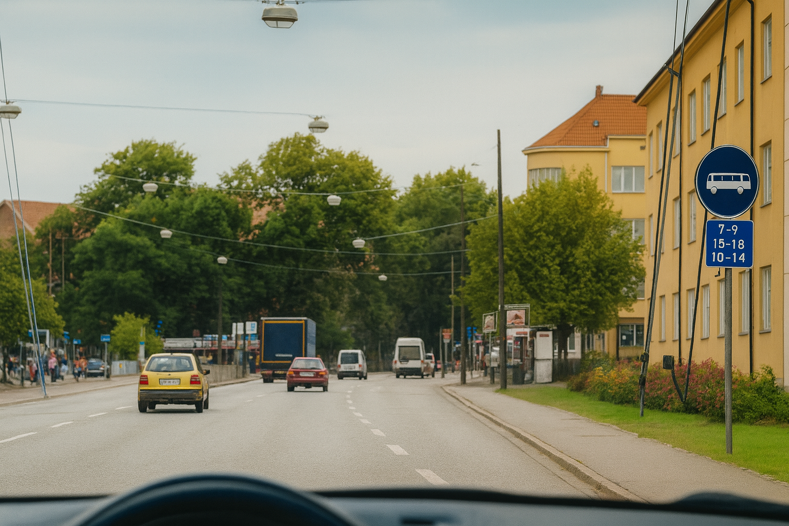Du kör en truistbuss och är på väg att hämta passagerare. Klockan är 08:00 på måndagsmorgonen. Får du använda körfältet längst till höger?