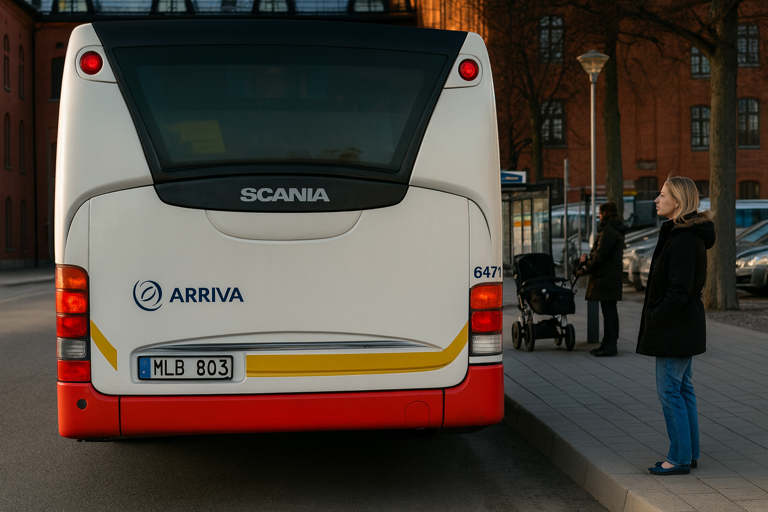 Du kör bussen på bilden och ska lämna hållplatsen. Bussen är utrustad med styrbar bakaxel. Vilken är den största risken om du måste styra kraftigt åt vänster?