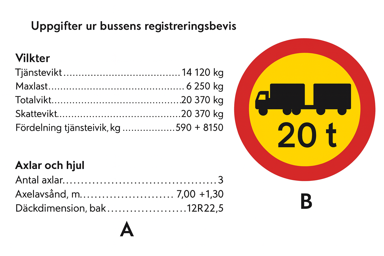 Du kör din buss som beskrivs med uppgifter i registreringsbeviset på bild A. Får du passera vägmärk på bild B om bussen är lastad halva maxlasten?