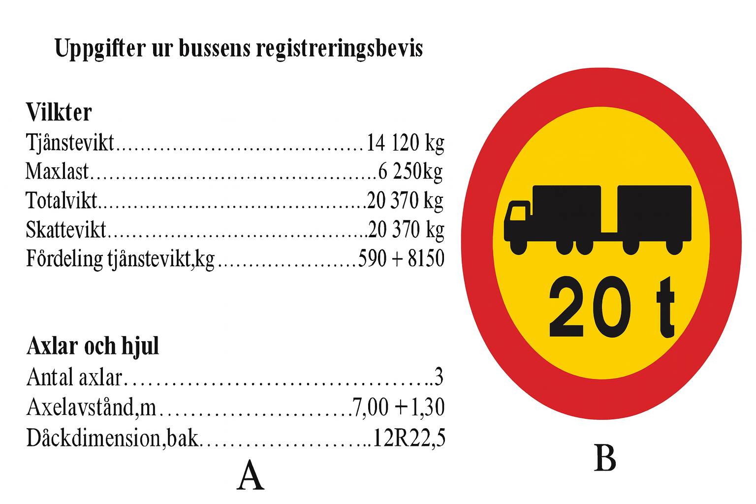 Du kör en buss som har de värden och uppgifter i registreringsbeviset som du ser på bild A. Får du passera vägmärket på bild B om bussen har maxlast?