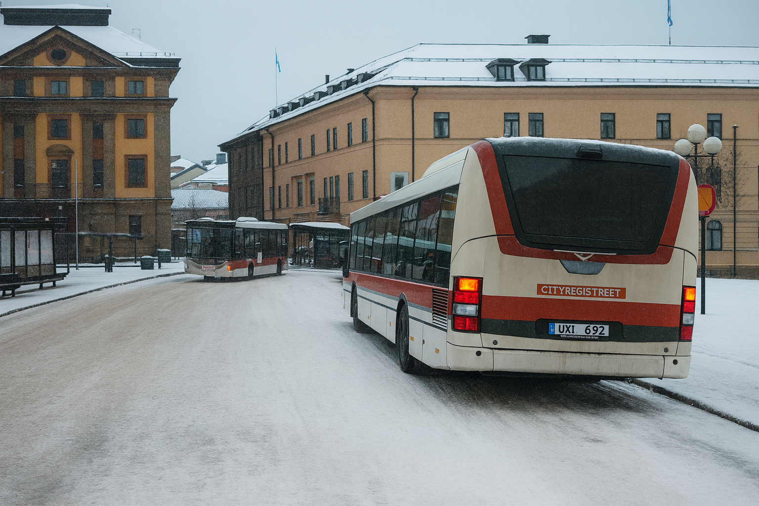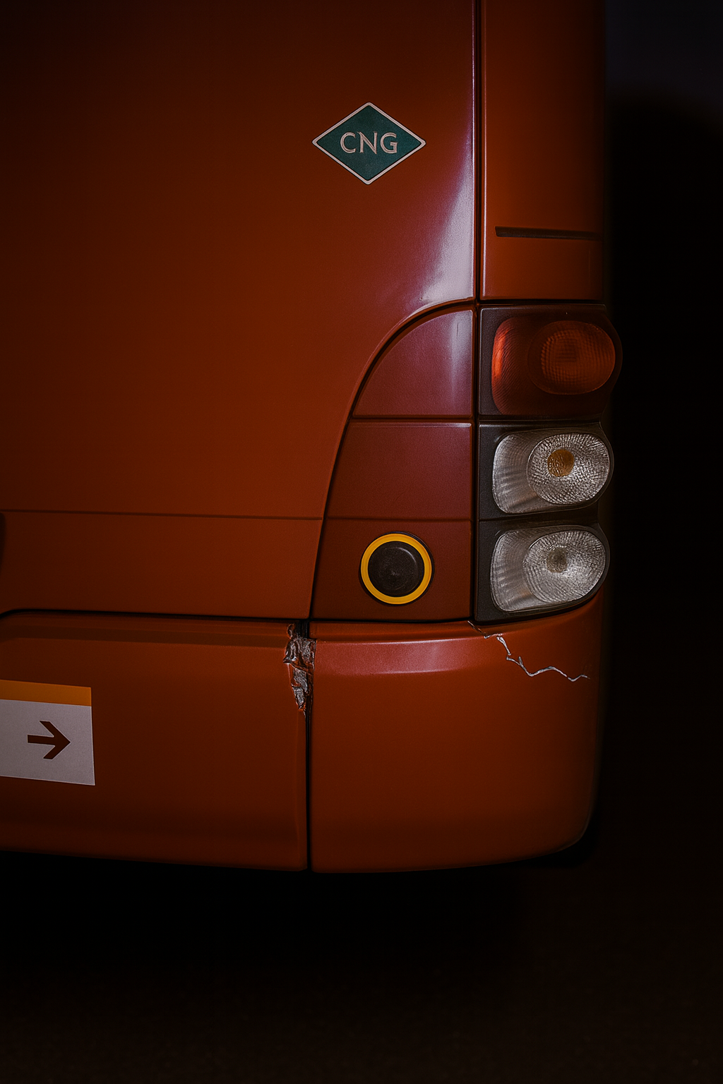 Bussen på bilden fått en skada baktill. Bussen är en ledbuss med styrbar bakaxel. Vilken är den troligaste orsaken till att skadan uppstod?
