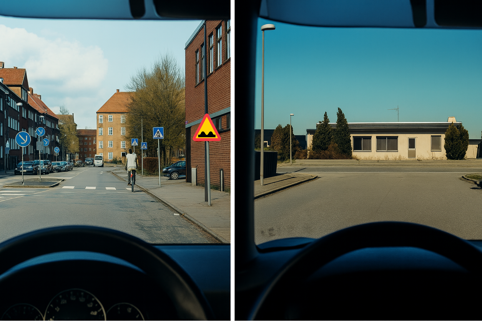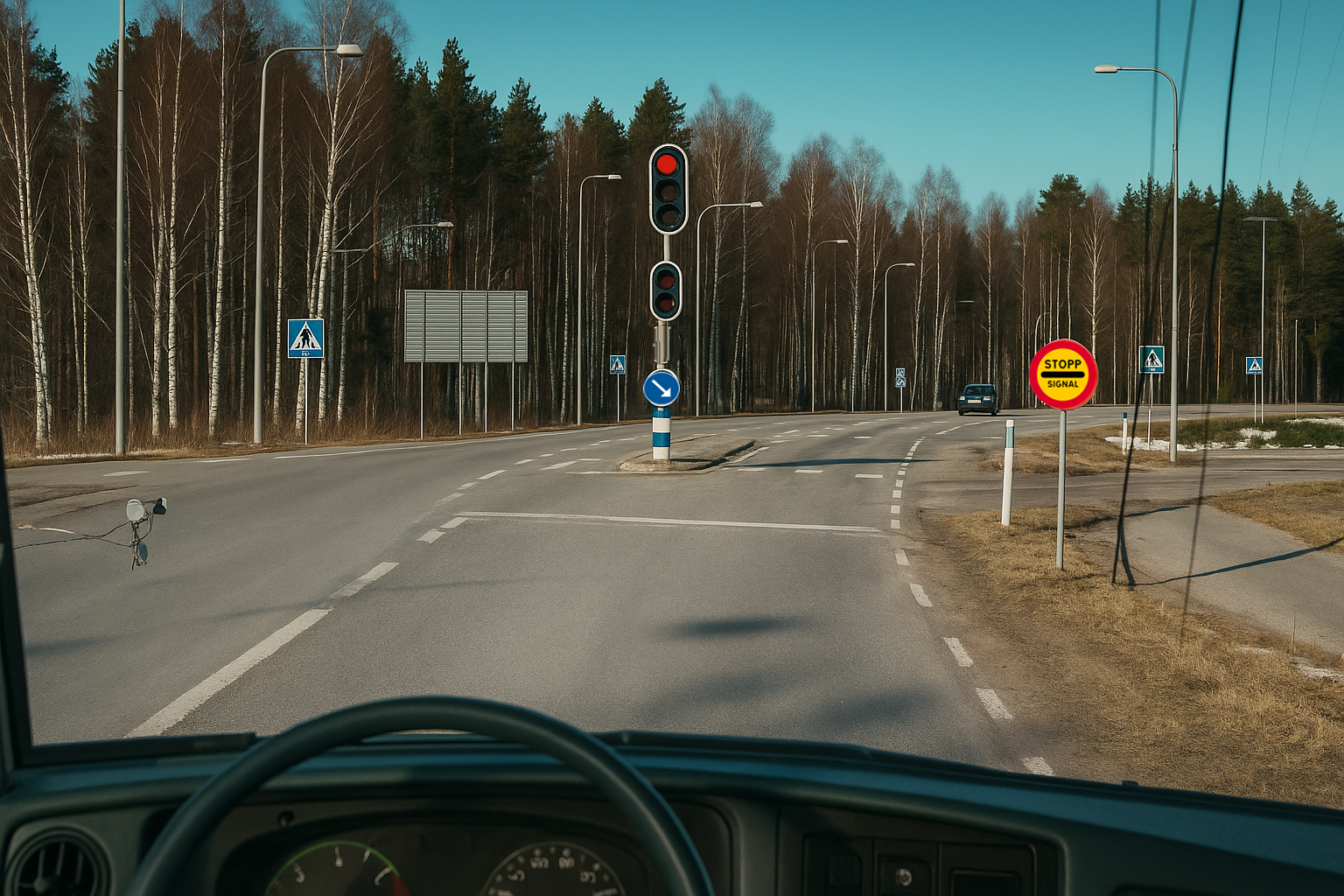 Du kör buss och du ska svänga till vänster i den närmaste korsningen. Hur du väjningsplikt mot trafik från höger i någon av korsningarna?
